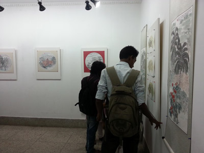 屈光洲代办在画家和嘉宾陪同下观看画展 展览共展出4名中国画家在拉杰沙希期间采风创作的22幅作品,作品以油画、国画等不同的表现形式,通过中国画家的独到视角展现了孟别具特色的自然景观和人文风情。展览吸引了大批孟青年学生和美术爱好者,热情的孟青年观众把中国画家团团围住,争相提问并发表看法,现场气氛热烈。
