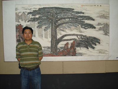 画家何等杰在作品迎客松前留影