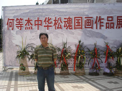 中国绘画艺术是人类社会宝贵的精神财富,是文明社会的崇高境界,更是人类心灵的窗户,灵魂的象征,绚丽多彩的现代文化艺术无一不凝聚着世界人民的智慧结晶。绘画以她独有的魅力,影响推动着新时代的进步。当我们领略着世界文化艺术深刻内涵,传承着不同民族的艺术珍品时,让人更加缅怀缔造艺术的大师们。 2008年12月何等杰国画展“中华松魂”在南京博物院隆重开幕,其画展得到美术界的好评和认可,今年应安徽各界朋友和书画家邀请再次举办“中华松魂”何等杰国画作品交流展,画展将展出60余幅作品,包括黄山十大名松等代表作。近几年何等杰多次到黄山采风创作,遍览祖国名山大川,其风雨晦冥,或晴开佚荡,长松古桧、山水或大势奔腾,或春云浮空,气韵飞荡。尤其笔下的松树简繁总宜,骨力挺拔、令人遐想,给人治思,回味无尽,中华松魂已成为北方画派一道亮丽风景。 何等杰在北京拜访名家老师数几十位潜心习画,在中央美院学习期间深得张凭教授、崔晓东教授等老师前辈的褒奖和推举,被著名画家娄师白先生誉为“基本功扎实,学有建树的当代青年画家”。 何等杰多次为会客厅创作巨幅作品《云海松涛》、《中华九龙松》、《卧龙松》、《山水峡江云》、《迎客松》。2006年时任联合国秘书长安南来华访问期间,应邀为安南作画《迎客松》,并教安南夫人学写中文,作品得到安南夫妇的赞赏,“中华松魂”国际友人收藏。 举办“中华松魂”何等杰个人画展,通过文化艺术交流,更好的提高自己的作品,希望老师多提宝贵意见,何等杰还很年轻,也很勤奋,在画坛已崭露头角,经过二十多年的探索研究,终于走出了自己独特的风格。